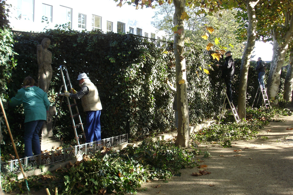 Am Samstag, dem 15.10.2011, haben einige Vereinsmitglieder im Platanenhain wuchernden Efeu zurückgeschnitten. Dies war nach der auch von unserem Verein vor kurzem veranlassten und finanzierten Bepflanzung der Pergolen auf der Ostseite des Ausstellungsgebäudes ein weiterer Schritt auf dem langen Weg, die Mathildenhöhe zum Weltkulturerbe der UNESCO anzumelden (siehe auch 'Presse'). (18.10.2011)